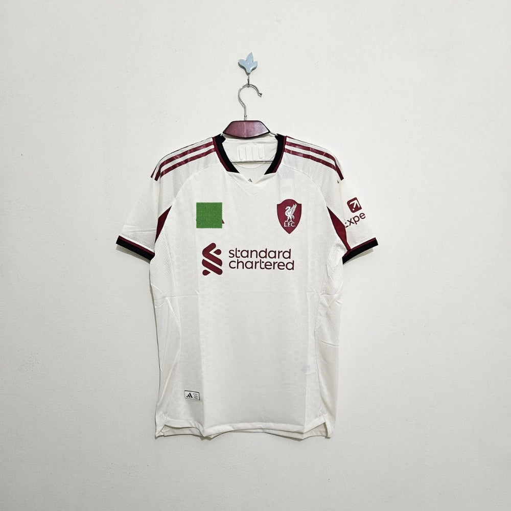 The Liverpool Away Kit 25/26 features a clean, contemporary design while maintaining the club’s iconic character. This design, with a refined Off-White color base with striking Red and Black accents, exudes a clean yet powerful presence, making it ideal for the Reds on the road.